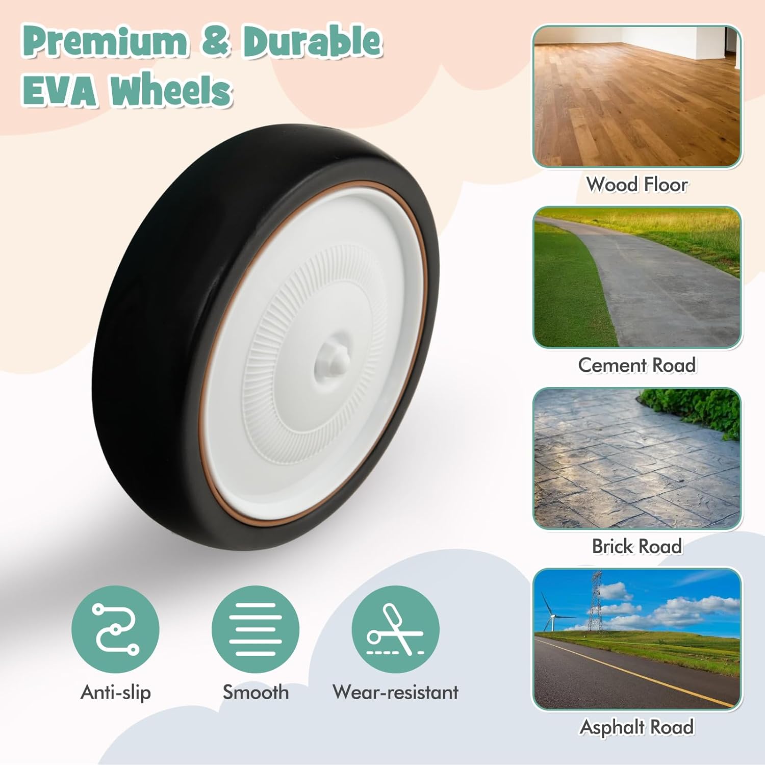πŸ›ž All-Terrain EVA Wheels – Large, shock-absorbing wheels are wear-resistant, floor-friendly, and suitable for both indoor and outdoor play